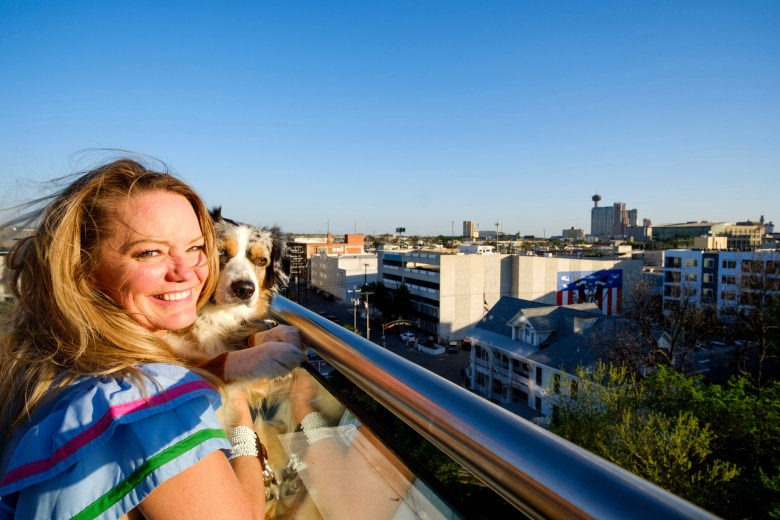 Stephanie Breithaupt and her dog Malibu pose for a portrait as they enjoy the view of the city from their apartment in the Museum Reach neighborhood. Credit: Clint Datchuk for the San Antonio Report