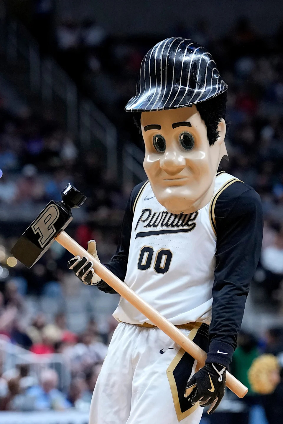 Purdue Pete, mascot of the Purdue Boilermakers, reacts against the Texas Longhorns in the Sweet Sixteen of the 2026 NCAA Men’s Basketball Tournament at SAP Center on March 26, 2026 in San Jose, California