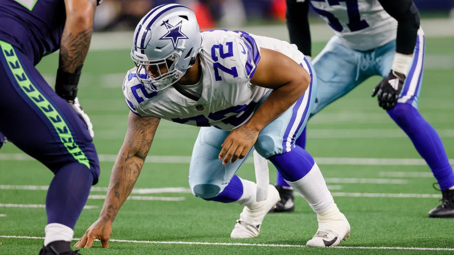 ARLINGTON, TX – AUGUST 26: Dallas Cowboys defensive tackle Trysten Hill (72) waits for the snap during the game between the Dallas Cowboys and the Seattle Seahawks on August 26, 2022 at AT&T Stadium in Arlington, Texas. (Photo by Matthew Pear