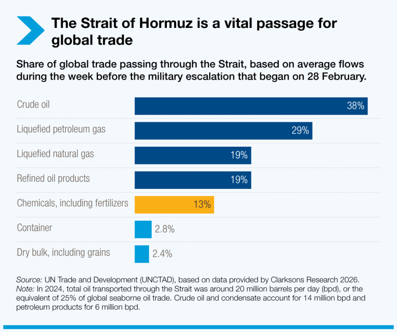 About one-third of the world’s globally traded fertilizer goes through the Strait of Hormuz, so its limited access has hampered food production in an already stressed agricultural industry, according to the United Nations Trade and Development.