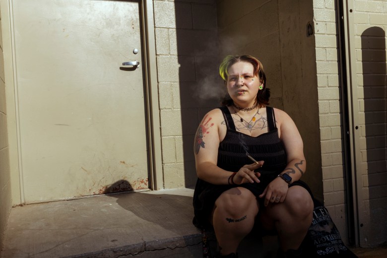 Kasper Plaza poses for a portrait in Austin and smokes a rolled hemp-derived THCA joint before Texas bans the sale of such products. Plaza says they use THC as medication.