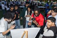 Students and faculty examine Student Government election results during Party After the Polls on March 31 at Brazos Park. The results for student senators will not be announced until April 2.