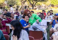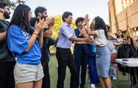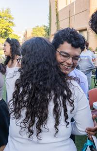 Andres Morales, Student Government vice president, left, and UTA Ambassador Aniyah Coston go in for a hug during Party After the Polls on March 31 at Brazos Park. Morales was elected as the Student Body president, and Coston as the vice president.