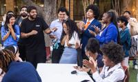 Public health major Martin Camarillo was congratulated by friends as his name was called for Mr. UTA.