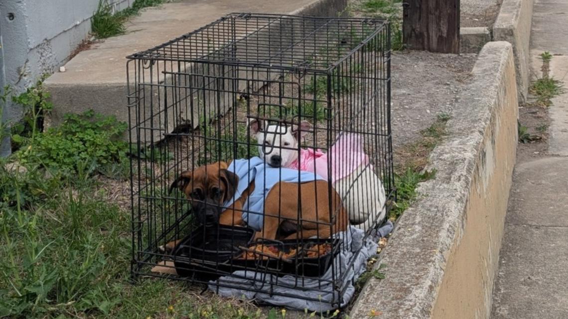 Harmony and Hazelnut were found together inside a kennel near a dumpster, dressed in small outfits with containers of food left beside them.