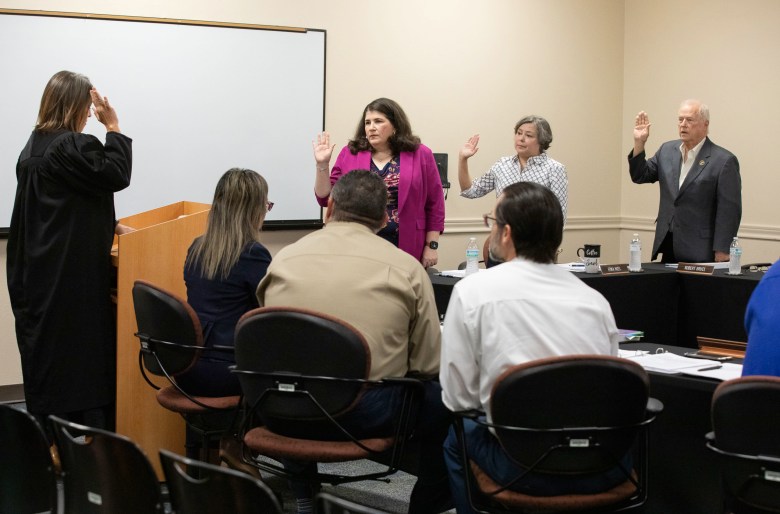 The three elected members of the Bexar Appraisal District’s board of directors (from left) Naomi Elizabeth Miller, Erika Hizel and Robert Bruce, shown being sworn in. Credit: Scott Ball / San Antonio Report