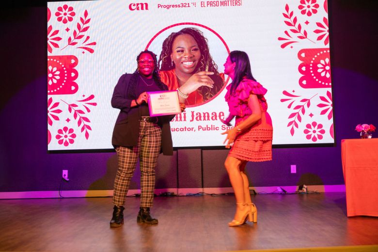 A young stand-in accepts the ChangeMakers: Borderland Women in the Arts award for Josey Pickett from Stephanie Hernandez, Thursday, March 26, 2026. (Photos by Liliana Chavez)