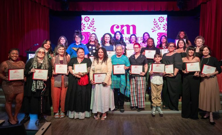 The 2026 ChangeMakers: Borderland Women in the Arts honorees pose with their awards at the Mexican American Cultural Center Auditorium. (Photos by Liliana Chavez)