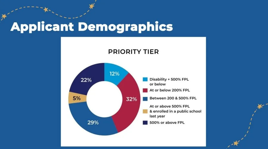 The data shows 12% of the applications came from the highest priority tier — students with a disability who live at or below 500% of the federal poverty level.