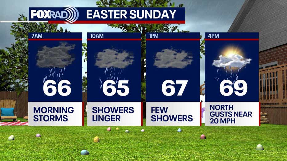Showers and storms may linger into Easter Sunday, with the best chance early in the day. Expect muddy grass and wet roads with improving conditions possible later in the afternoon. Temperatures will take a noticeable dip as well, with highs in the afternoon going from the 80s to the 60s. Plan accordingly as you put your Easter outfits together and watch out for a few potential flooded streets.