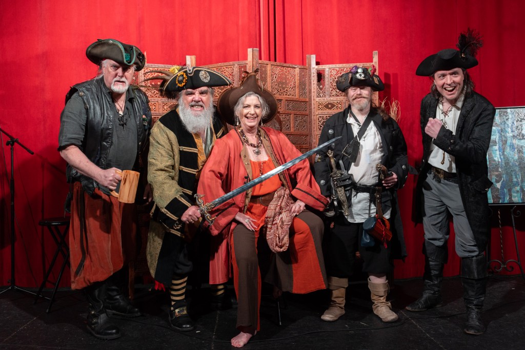 Members of the Fort Worth Poetry Society dressed in pirate garb accompany President Steve Sanders and his wife, Melody Sanders, on the Farr Best Theater stage in Mansfield. (Mica Magday for the Fort Worth Report)