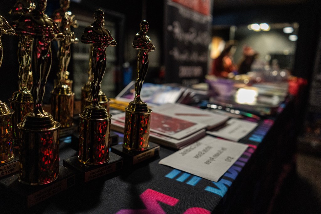 In-house awards are lined up next to published chapbooks written by members of the poetry society. (Mica Magday for the Fort Worth Report)
