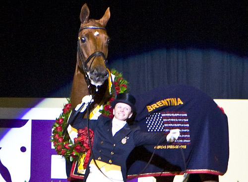 Brentina with Debbie McDonald at the retirement of the World Cup championship horse at the 2009 World Cup Final, fittingly at the Thomas and Mack Arena named for Parry Thomas one of the owners of Brentina, in Las Vegas. © Ken Braddick/DRESSAGE-NEWS.com