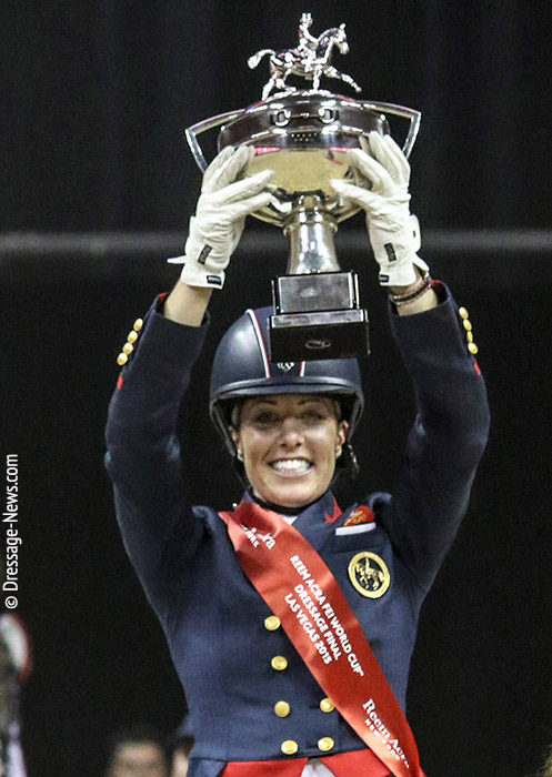 Charlotte Dujardin at Las Vegas in 2015 holding aloft the World Cup she won for the second time on Valegro. © 2015 Ken Braddick/DRESSAGE-NEWS.com