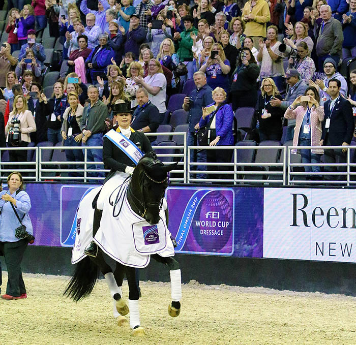 Isabell Werth riding Weihegold OLD in the victory lap at the World Cup Final in Omaha in 2017. © Ken Braddick/DRESSAGE-NEWS.com
