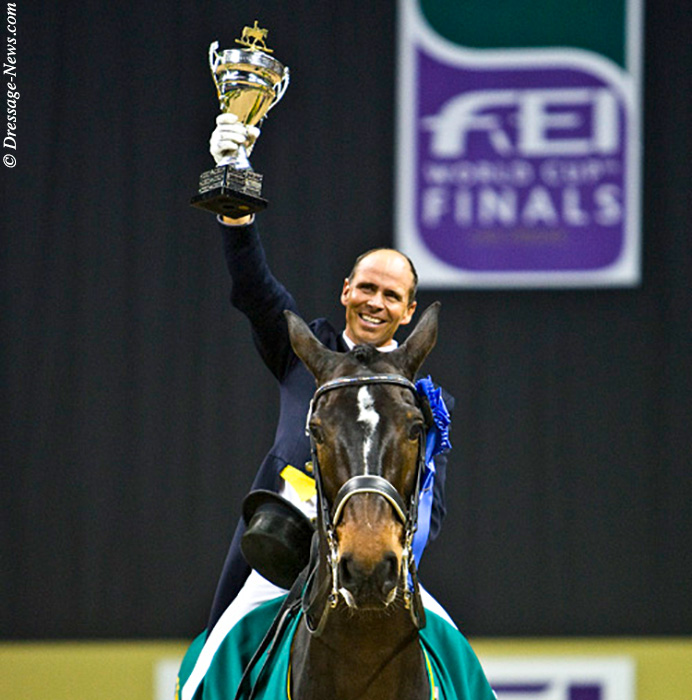 Steffen Peters on Ravel holding aloft the World Cup won at Las Vegas in 2009. © Ken Braddick/DRESSAGE-NEWS.com