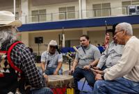 Drum circle members play the drums during the Native American Student Association’s 30th annual Benefit Powwow on April 4 at the Maverick Activities Center. The event included a gourd dance and grand entries.