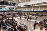 People gather in a gymnasium.