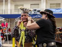 Scott Riding-In gets help securing his head piece during the Native American Student Association’s 30th annual Benefit Powwow on April 4 at the Maverick Activities Center. Scott Riding-In is brother of Les Riding-In, who was honored during the powwow.