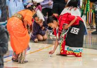 Contestant Amara Iron Shield, 9, picks up candy from the floor during the 30th annual Benefit Powwow on April 4 at the Maverick Activities Center. Iron Shield’s family traveled from Kansas for the event.