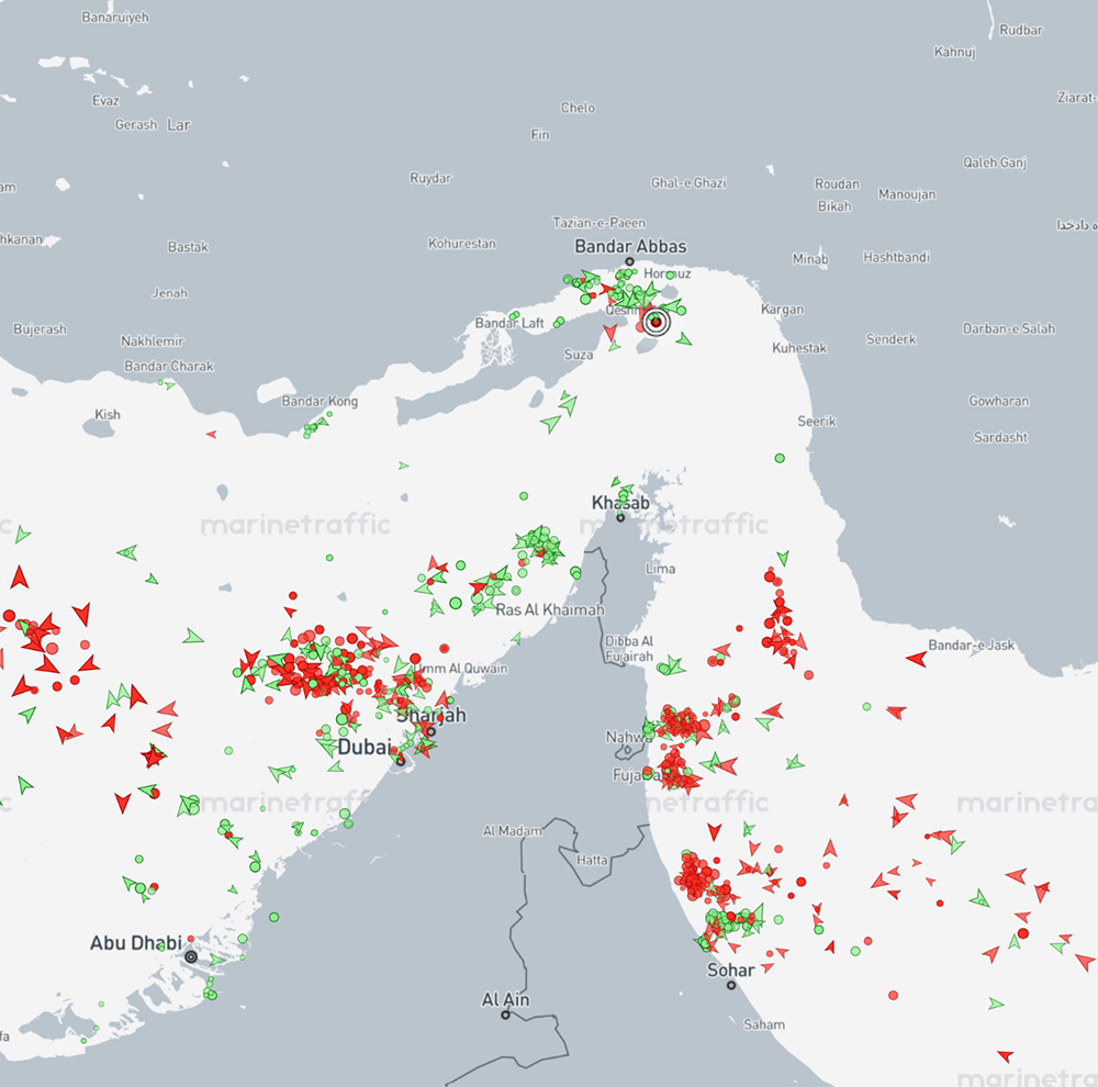 Traffic in the Strait of Hormuz this morning remains stopped with oil and cargo vessels congregating around Larak Island and west of the Strait. Iran has used Larak Island as a “toll booth” to collect around $2 million from vessels that want to transit the Strait and to inspect the vessels before allowing them through in recent weeks.