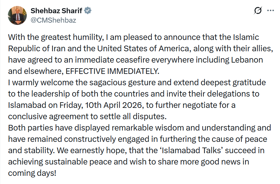 The first signs of a ceasefire emerged yesterday at around 7:00 in the evening when Pakistani Prime Minister, Shehbaz Sharif, announced on social media that the U.S. and Iran had “agreed to an immediate ceasefire including Lebanon and elsewhere, EFFECTIVE IMMEDIATELY.”