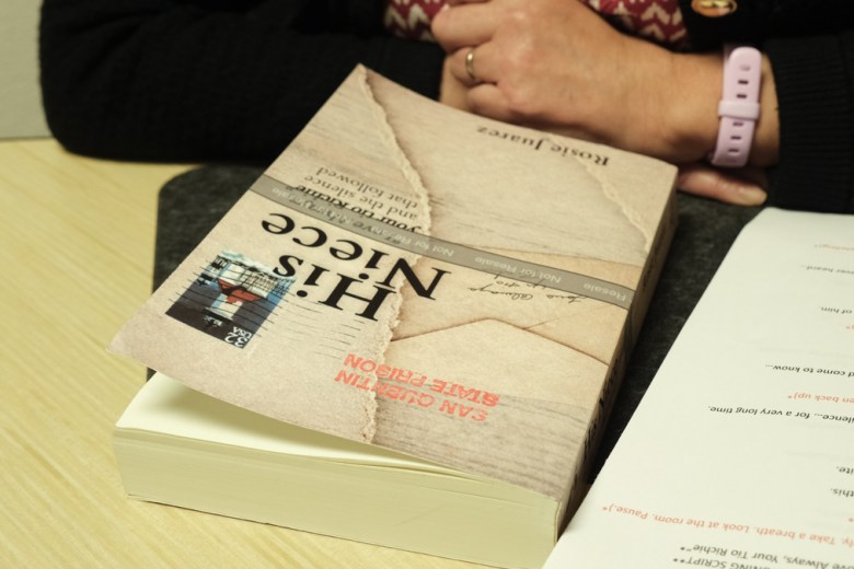 A copy of Rosie Juárez’s memoir, “His Niece,” sits on the table during an interview April 7, 2026, detailing her experiences, the abuse she says she endured and her process of healing. (Brandy Ruiz / El Paso Matters)