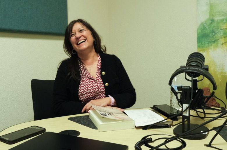 Rosie Juárez laughs during an interview April 7, 2026, as she recalls moments from her life and the journey that led her to share her story publicly in a new memoir. (Brandy Ruiz / El Paso Matters)