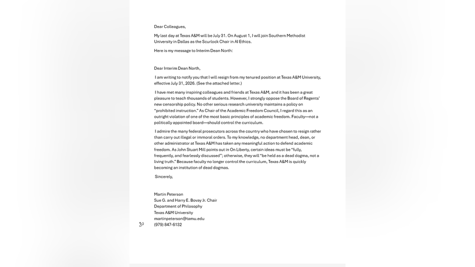 “But now we have a list of prohibited topics, things that we cannot teach,” Peterson said in a Friday interview with FOX Local. “And then A&M cannot explain or motivate that in a reasonable way. No serious research university in the world has a list of prohibited topics that professors may not teach.”