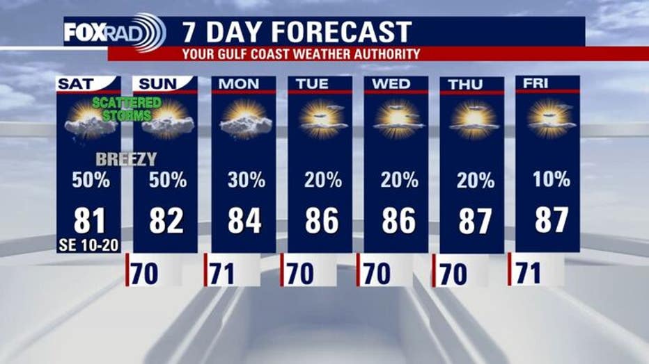 Rain fades early next week with partly cloudy skies returning. Highs climb into the mid to upper 80s with muggy Gulf breezes.
