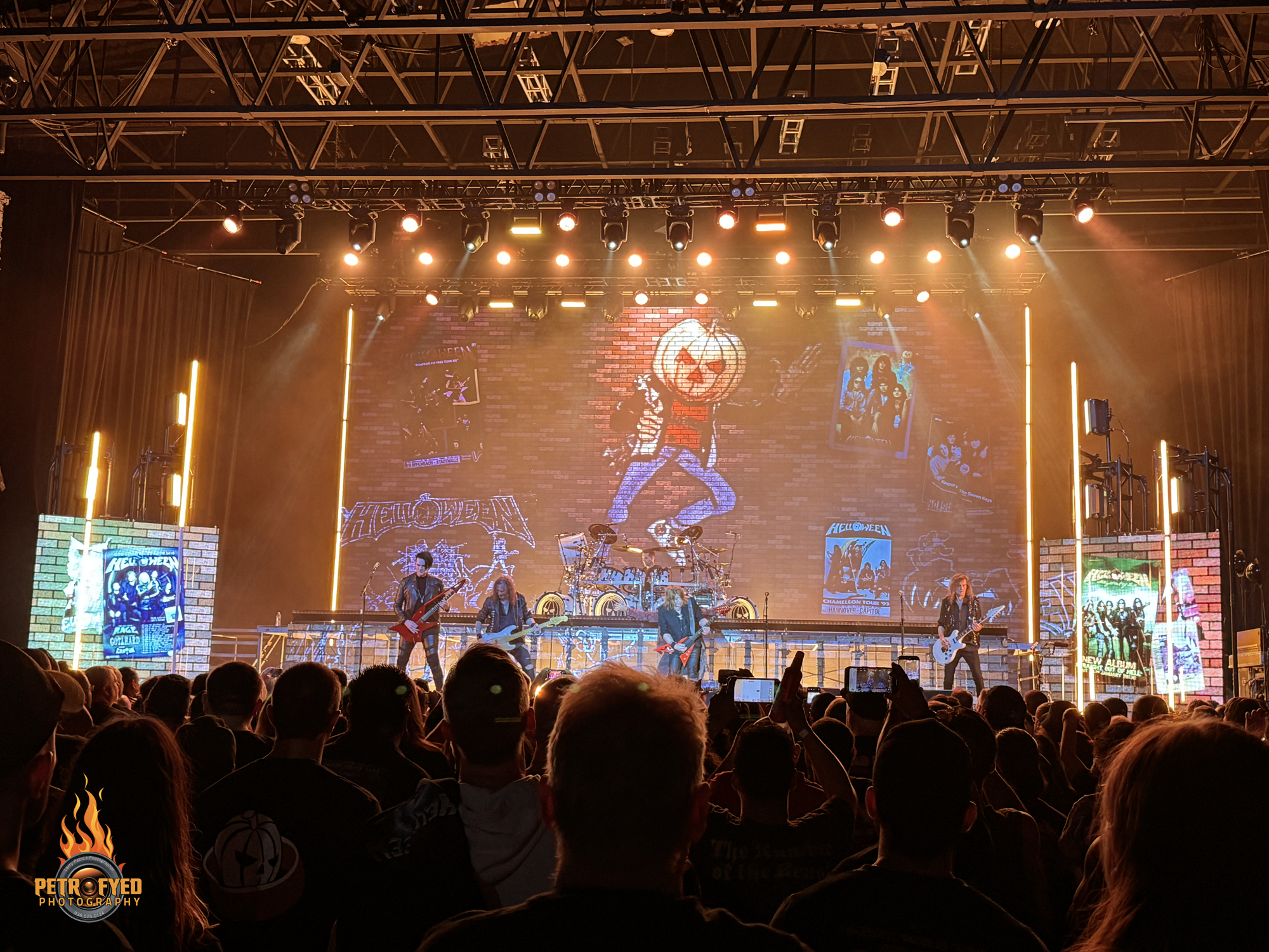 At precisely 7:45, following a swift stage changeover, the house lights dimmed and a roar surged through the crowd. A towering video screen at the back of the stage flickered to life, its ominous, trademark eyes slowly parting to reveal a stark, mountainous landscape. As the visual journey unfolded—album imagery crashing into the terrain while the camera swept dramatically through the scene—the PA thundered with Robbie Williams’ “Let Me Entertain You,” followed by “Interlude.” Moments later, HELLOWEEN stormed the stage, opening with “March of Time”—a perfectly chosen overture for an anniversary tour steeped in legacy.