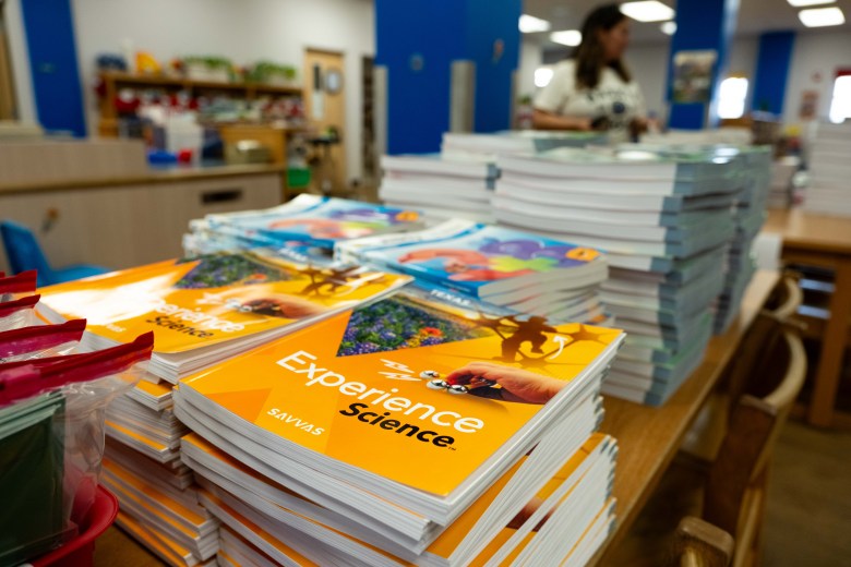 Science, math and English instructional materials are held in the library to be distributed to classes on the first day of school at Baskin Elementary on Aug. 13, 2025. Credit: Amber Esparza for the San Antonio Report