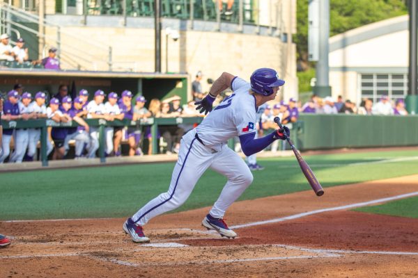 TCU first baseman Brady Dallimore runs towards first base after getting a hit at Lupton Stadium in Fort Worth, Texas, April 10, 2026. The Horned Frogs lost to the Arizona Wildcats 4-3 (TCU360/Logan Pope). (Logan Pope)