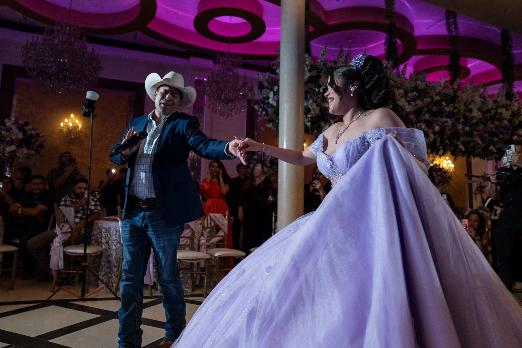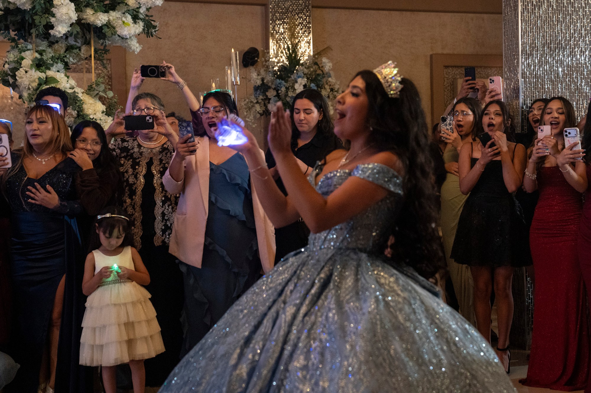 Jimena Sáenz’s guests film and dance along as Pulido sings during the quinceañera celebration in Edinburg. Gabriel V. Cárdenas for The Texas Tribune