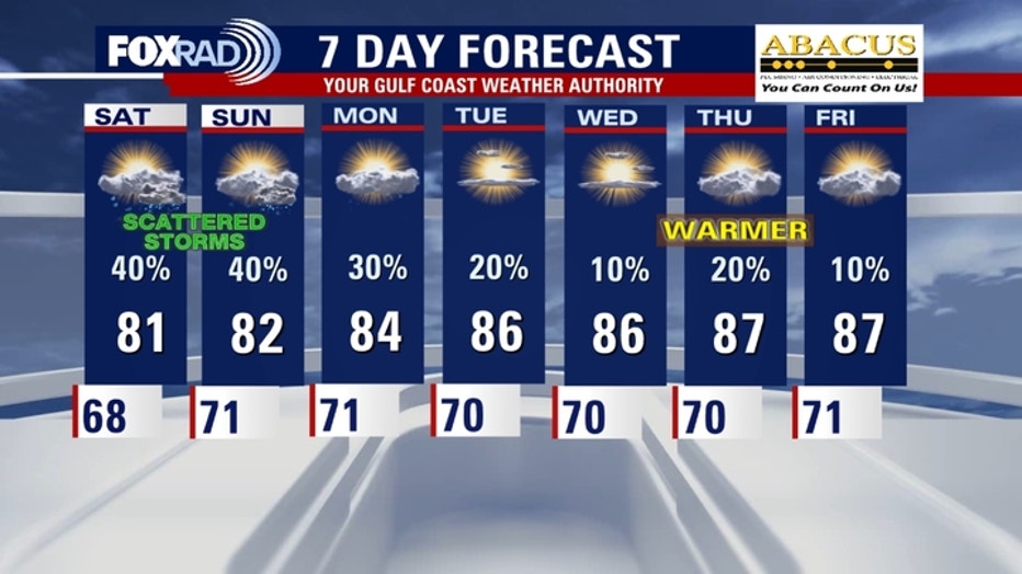 Temperatures remain near average during the afternoon, with highs in the low 80s and overnight lows near 70.