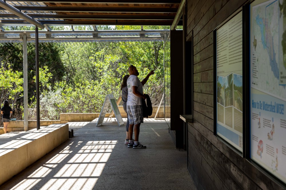 Visitors look at maps and local wildlife information boards near the entrance of the Urban Ecology Center at Phil Hardberger Park on April 8, 2026. Credit: Amber Esparza / San Antonio Report
