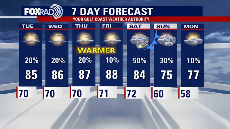 The overall pattern turns warmer as we head through the work week. Highs will climb into the mid to upper 80s by midweek and late week, with muggy nights holding in the upper 60s and low 70s. Rain chances stay fairly limited, though an isolated shower or storm is still possible at times.
