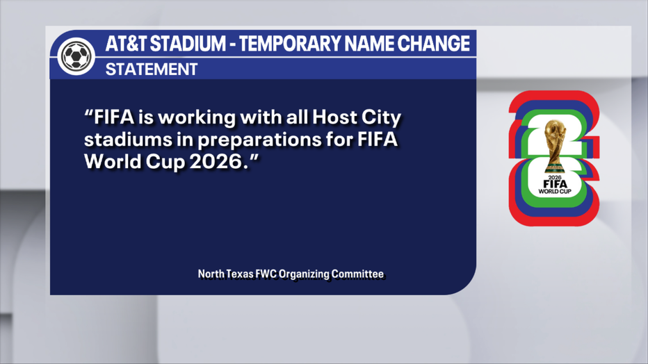 The Brief AT&T Stadium will be called Dallas Stadium during this summer’s FIFA World Cup.The name change is due to FIFA only allowing World Cup sponsor logos to be shown on the stadium.Several other U.S. stadiums that will host games this summer have already begun the process of changing their name for the tournament.