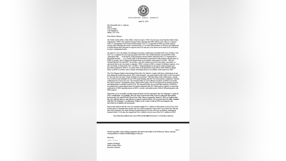 “The City of Dallas is in receipt of Governor Abbott’s letter regarding public safety grant funding and cooperation with federal immigration authorities,” a response from the city says. “We remain committed to complying with all applicable state and federal laws while continuing to prioritize public safety for the residents of Dallas, and ensuring our officers have the resources and support necessary to effectively serve the community. The City will respond in writing on or before April 23, 2026.”