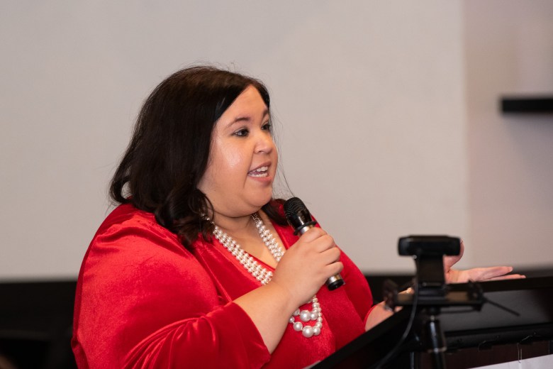 Katy Padilla Stout, candidate for Texas’ 23rd Congressional District, speaks at the Northeast Bexar County Democrats endorsement forum at Unity Church on Saturday, Feb. 14, 2026, in San Antonio. Credit: Salgu Wissmath for the San Antonio Report