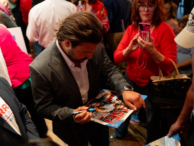 Brandon Herrera, Texas 23rd congressional district candidate, signs a cover of the magazine Skillset featuring him at a rally at the Angry Elephant. Credit: Brenda Bazán / San Antonio Report