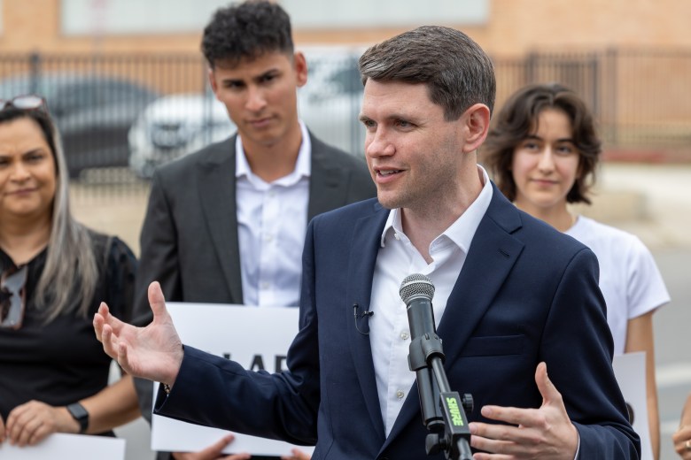 James Talarico, a Democratic candidate for U.S. Senate, speaks during a press conference outside Rhodes Middle School on San Antonio’s West Side, where he previously taught. Credit: Diego Medel / San Antonio Report