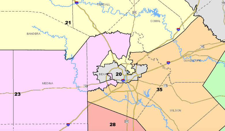 After redistricting, Bexar County is now divided between four congressional districts: TX20, TX21, TX23 and TX35. Credit: Texas Capitol