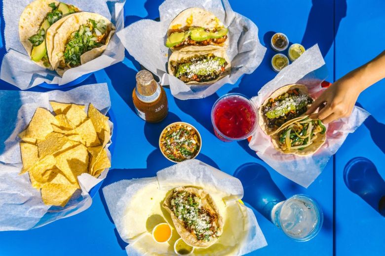 The taco menu is filled with fresh ingredients, many of them organic. Some of the breakfast tacos use Vital Farms eggs, while a vegan version features organic black beans, avocado and pico de gallo. Lunch and dinner tacos include pollo en mole, puerco verde, sirloin, and braised beef barbacoa. There are also snacks like esquites and chile con queso, plus margaritas, beer, and coffee drinks.