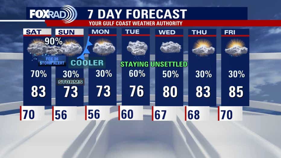 Southeast Texas stays warm, humid, and breezy through Saturday afternoon with highs in the 80s and south winds around 10–20 mph with higher gusts. Rain chances remain low for your Friday night plans. But look for showers and storms to gradually increase throughout the day on Saturday, with the worst of the heavy rain late Saturday night.  Late Saturday through early Sunday morning is when Houston will be under a FOX 26 Storm Alert.  There’s a risk for heavy downpours that could lead to a few flooded streets and some strong storms.