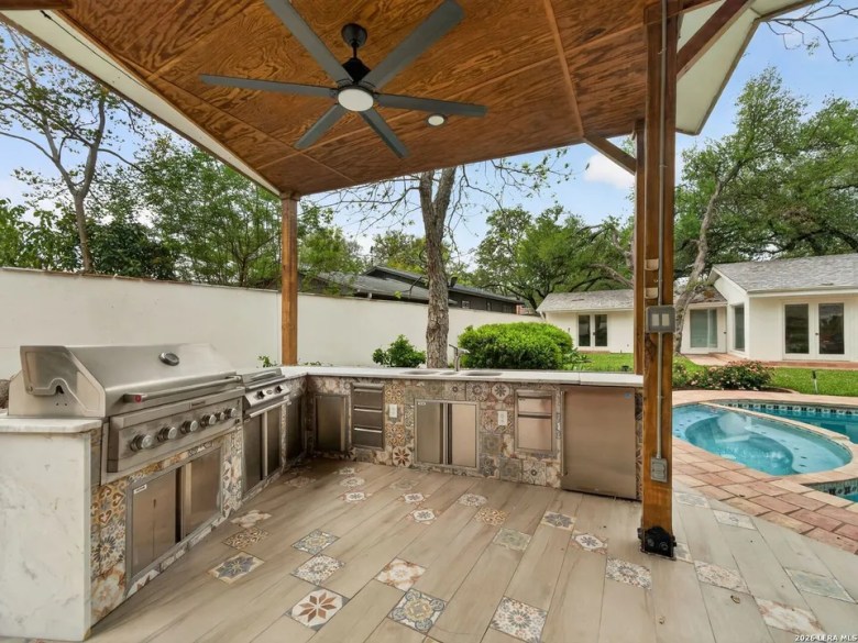 However, what may set it aside for home entertainers is a covered outdoor cooking area featuring multiple grilling surfaces, refrigerators, sinks and elegant tile work that keeps the Spanish theme going. The grilling oasis is also steps away from the gorgeous backyard pool and veranda.