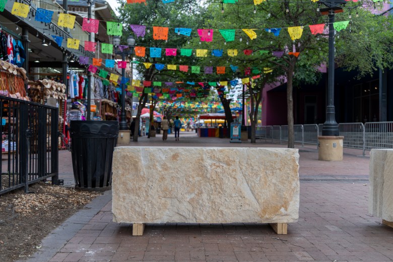 Concrete barriers are placed at entrances to the Fiesta de los Reyes event at Historic Market Square. Credit: Diego Medel / San Antonio Report