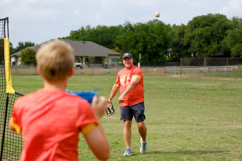Tim Christ and his son Kaleb play catch as part of their training at Fair Oaks Ranch Elementary school. Credit: Clint Datchuk for the San Antonio Report