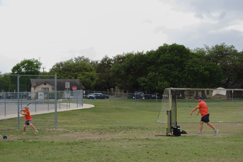 Tim Christ and his son Kaleb have hitting practice at the Fair Oaks Ranch Elementary school, where they have had practice almost every day for the last 5 years. Credit: Clint Datchuk for the San Antonio Report