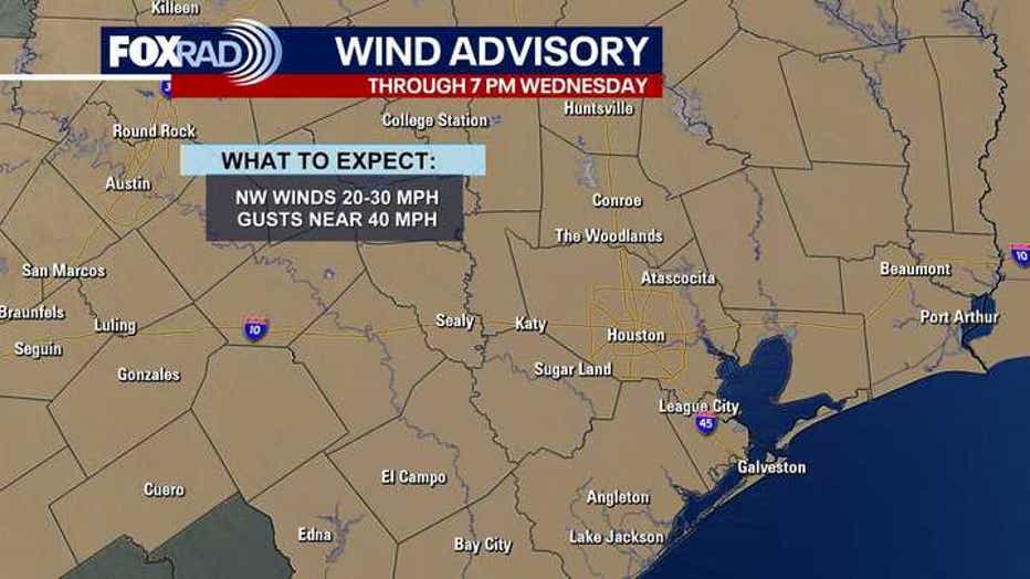 A Wind Advisory has also been issued until 7pm Wednesday for the entire area with gusts near 40 mph likely.